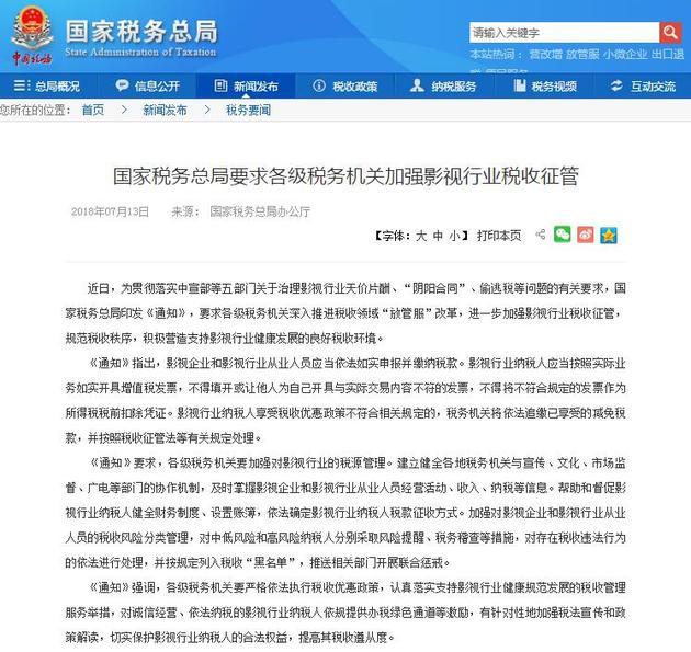 近日,國(guó)家稅務(wù)總局印發(fā)《通知》,進(jìn)一步加強(qiáng)影視行業(yè)稅收征管,規(guī)范稅收秩序,積極營(yíng)造支持影視行業(yè)健康發(fā)展的良好稅收環(huán)境?!锻ㄖ分赋?,影視企業(yè)和影視行業(yè)從業(yè)人員應(yīng)當(dāng)依法如實(shí)申報(bào)并繳納稅款。影視行業(yè)納稅人應(yīng)當(dāng)按照實(shí)際業(yè)務(wù)如實(shí)開(kāi)具增值稅發(fā)票,不得填開(kāi)或讓他人為自己開(kāi)具與實(shí)際交易內(nèi)容不符的發(fā)票,不得將不符合規(guī)定的發(fā)票作為所得稅稅前扣除憑證?!锻ㄖ芬?,各級(jí)稅務(wù)機(jī)關(guān)要加強(qiáng)對(duì)影視行業(yè)的稅源管理。依法確定影視行業(yè)納稅人稅款征收方式。加強(qiáng)對(duì)影視企業(yè)和影視行業(yè)從業(yè)人員的稅收風(fēng)險(xiǎn)分類(lèi)管理,對(duì)存在稅收違法行為的依法進(jìn)行處理,并按規(guī)定列入稅收“黑名單”,推送相關(guān)部門(mén)開(kāi)展聯(lián)合懲戒。