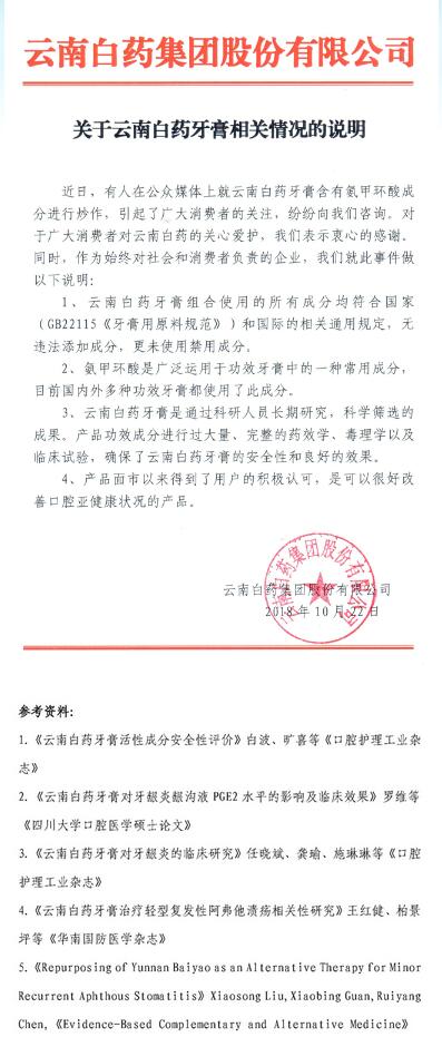 云南白藥官方聲明:云南白藥牙膏未使用禁用成分,氨甲環(huán)酸是廣泛運用于功效牙膏中的一種常用成分,目前國內(nèi)外多種功效牙膏都有使用。