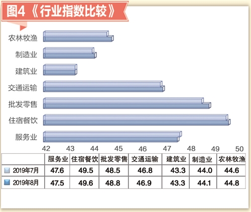 8月份小微企業(yè)信心指數(shù)為49.2,上升0.2個(gè)點(diǎn)。分行業(yè)來看,呈現(xiàn)“五升兩降”態(tài)勢(shì)。其中,農(nóng)林牧漁業(yè)小微企業(yè)信心指數(shù)為50.0,下降0.4個(gè)點(diǎn);制造業(yè)小微企業(yè)信心指數(shù)為50.6,上升0.3個(gè)點(diǎn);建筑業(yè)小微企業(yè)信心指數(shù)為43.3,上升0.1個(gè)點(diǎn);交通運(yùn)輸業(yè)小微企業(yè)信心指數(shù)為47.6,下降0.2個(gè)點(diǎn);批發(fā)零售業(yè)小微企業(yè)信心指數(shù)為50.3,上升0.3個(gè)點(diǎn);住宿餐飲業(yè)小微企業(yè)信心指數(shù)為50.1,上升0.2個(gè)點(diǎn);服務(wù)業(yè)小微企業(yè)信心指數(shù)為45.6,上升0.2個(gè)點(diǎn)。