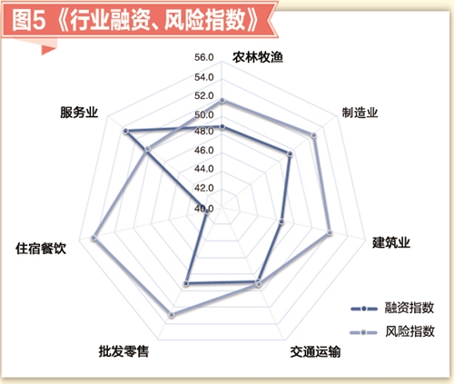 小微企業(yè)的風(fēng)險(xiǎn)指數(shù)(見圖5)為52.3,與上月持平。農(nóng)林牧漁業(yè)小微企業(yè)風(fēng)險(xiǎn)指數(shù)為51.7,下降0.1個(gè)點(diǎn);制造業(yè)小微企業(yè)風(fēng)險(xiǎn)指數(shù)為52.7,下降0.1個(gè)點(diǎn);建筑業(yè)小微企業(yè)風(fēng)險(xiǎn)指數(shù)為52.0,上升0.3個(gè)點(diǎn);交通運(yùn)輸業(yè)小微企業(yè)風(fēng)險(xiǎn)指數(shù)為49.2,上升0.3個(gè)點(diǎn);批發(fā)零售業(yè)小微企業(yè)風(fēng)險(xiǎn)指數(shù)為52.9,上升0.2個(gè)點(diǎn);住宿餐飲業(yè)小微企業(yè)風(fēng)險(xiǎn)指數(shù)為54.4,上升0.1個(gè)點(diǎn);服務(wù)業(yè)小微企業(yè)風(fēng)險(xiǎn)指數(shù)為50.4,下降0.3個(gè)點(diǎn)。調(diào)研結(jié)果顯示,七大行業(yè)流動(dòng)資金周轉(zhuǎn)指數(shù)呈現(xiàn)“五升兩降”態(tài)勢(shì),其中除制造業(yè)和服務(wù)業(yè)外,其他行業(yè)的流動(dòng)資金周轉(zhuǎn)速度均有所加快;回款周期表現(xiàn)為“三升四降”態(tài)勢(shì),其中除建筑業(yè)、交通運(yùn)輸業(yè)和批發(fā)零售業(yè)外,其他行業(yè)的回款周期均有所延長(zhǎng)。