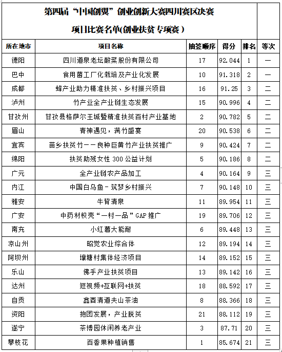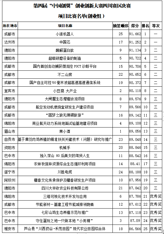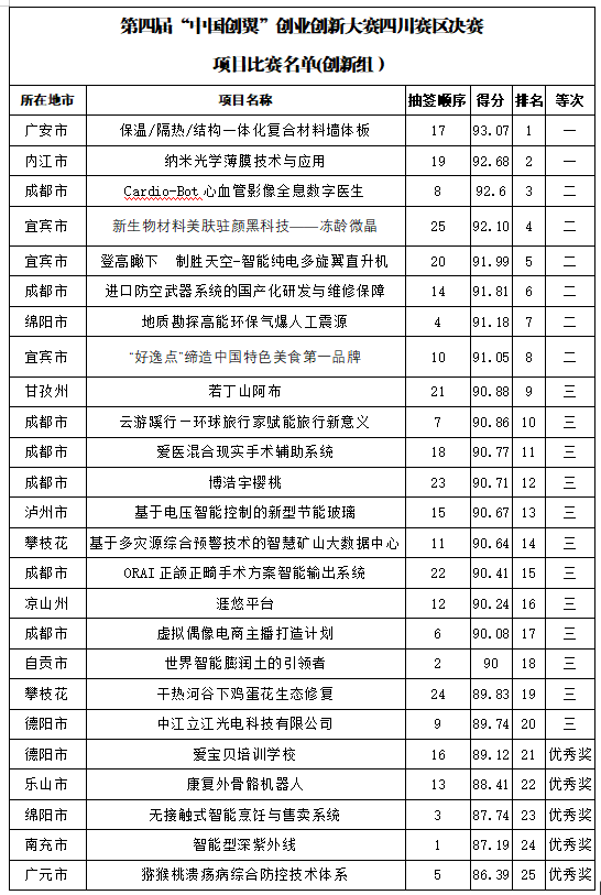 經(jīng)過(guò)激烈角逐,來(lái)自成都、達(dá)州、德陽(yáng)、巴中、廣安、內(nèi)江的6個(gè)項(xiàng)目斬獲一等獎(jiǎng),九個(gè)項(xiàng)目將被推薦到全國(guó)大賽,分別是創(chuàng)新組前四名、創(chuàng)業(yè)組前四名和專項(xiàng)扶貧組第一名,一起來(lái)看看獲獎(jiǎng)名單: