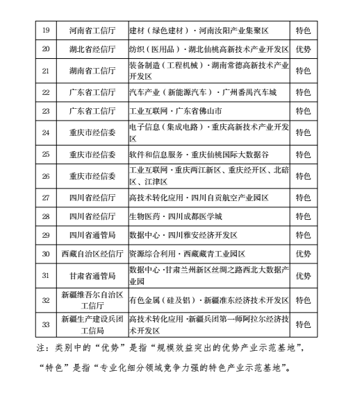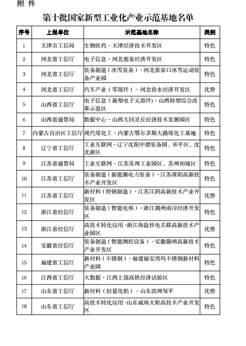 根據(jù)《國家新型工業(yè)化產(chǎn)業(yè)示范基地管理辦法》(工信部規(guī)〔2017〕1號)、《關(guān)于開展2021年度國家新型工業(yè)化產(chǎn)業(yè)示范基地申報(bào)工作的通知》(工信廳規(guī)函〔2021〕85號)要求,經(jīng)評審和公示,現(xiàn)將天津經(jīng)濟(jì)技術(shù)開發(fā)區(qū)等33個(gè)國家新型工業(yè)化產(chǎn)業(yè)示范基地名單予以公布。有關(guān)事項(xiàng)通知如下: