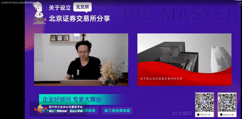 2021年10月12日,四川省中小企業(yè)公共服務(wù)平臺、中國中小企業(yè)四川網(wǎng),聯(lián)合大師兄(上海)云數(shù)據(jù)服務(wù)有限公司聯(lián)合舉辦了主題為“北交所關(guān)于設(shè)立北京證券交易所分享”的線上云課堂講座,為中小企業(yè)特別是‘專精特新’企業(yè)開展了證券交易相關(guān)的主題培訓(xùn)。來自中小企業(yè)、服務(wù)機構(gòu)等共5546人次參加了在線培訓(xùn)。