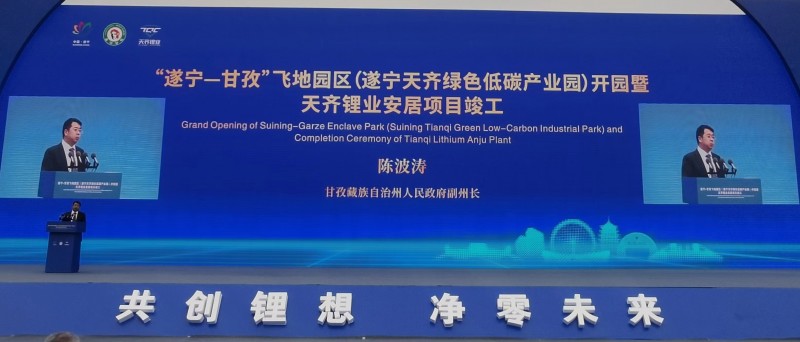 10月26日,“遂寧-甘孜”飛地園區(qū)開園掛牌儀式在遂寧市安居經(jīng)開區(qū)天齊鋰業(yè)2萬噸碳酸鋰項目現(xiàn)場舉行。四川省人大常委會副主任何禮,澳大利亞駐成都總領(lǐng)事館總領(lǐng)事倪瑞蘭,中國有色金屬工業(yè)協(xié)會副秘書長、鋰業(yè)分會會長李宇圣,遂寧市人大常委會主任周霖臨,遂寧市委常委、常務(wù)副市長江彬,遂寧市政府副市長許文強,甘孜州政府副州長陳波濤,天齊鋰業(yè)股份有限公司董事長蔣衛(wèi)平,天齊鋰業(yè)股份有限公司總裁夏浚誠出席儀式。