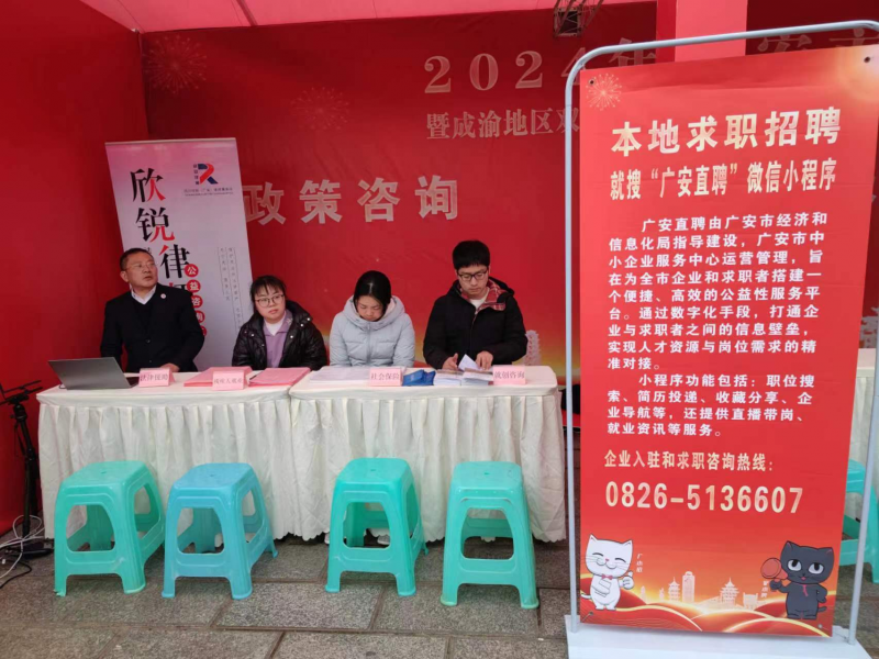 2月20日,中心參加由市人社局主辦的“2024年廣安市春風(fēng)行動”招聘會,中心工作人員現(xiàn)場為求職者提供就業(yè)創(chuàng)業(yè)咨詢服務(wù),積極宣傳“廣安直聘”微信小程序并推薦使用,此次活動共計發(fā)放工業(yè)企業(yè)招聘崗位匯編200余冊。