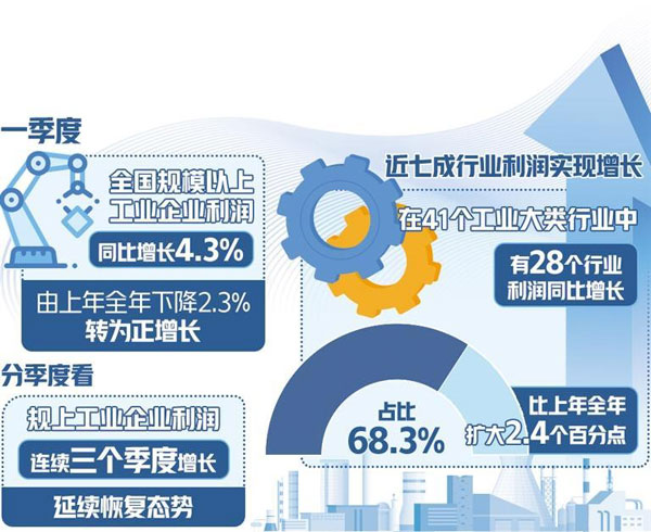 市場需求逐步改善,新動能加快成長,帶動企業(yè)營收繼續(xù)恢復(fù)。一季度,規(guī)上工業(yè)企業(yè)營業(yè)收入同比增長2.3%,增速比上年全年加快1.2個百分點。國家統(tǒng)計局工業(yè)司統(tǒng)計師于衛(wèi)寧表示,當(dāng)季營收連續(xù)3個季度增長,為企業(yè)盈利持續(xù)恢復(fù)創(chuàng)造有利條件。